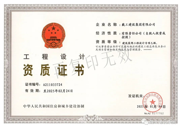 戴工建設(shè)集團有限公司系一家集裝飾設(shè)計、工程施工、材料配送、木門、地板、家具、 裝飾品開發(fā)為一體的裝飾企業(yè)。公司位于北京市大興區(qū)。具有建委頒發(fā)的建筑裝飾裝修專業(yè) 壹級、防水保溫工程專業(yè)壹級、建筑幕墻專業(yè)貳級、消防設(shè)施專業(yè)貳級、電子與智能化專業(yè) 貳級,特種工程(結(jié)構(gòu)補強)專業(yè)不分等級、建筑機電安裝專業(yè)叁級、環(huán)保工程專業(yè)叁級、 鋼結(jié)構(gòu)專業(yè)叁級、建筑工程總承包叁級、建筑裝飾工程設(shè)計專項乙級、中國展覽館協(xié)會展覽 陳列工程設(shè)計與施工一體化壹級資質(zhì)和中國展覽館協(xié)會展覽工程企業(yè)資質(zhì)。公司通過了GB/T19001,IS014001,GB/T/OHSAS 認(rèn)證。主要從事辦公空間、餐飲酒店、商業(yè)空間、學(xué)校、 醫(yī)院、別墅、住宅等場所的裝修設(shè)計和施工。公司經(jīng)北京市工商管理局正式批準(zhǔn)注冊、北京市建委審核認(rèn)定,已取得國家正規(guī)資質(zhì), 為中國建筑裝飾協(xié)會、中國室內(nèi)裝飾協(xié)會、北京室內(nèi)裝飾協(xié)會、北京市建筑裝飾協(xié)會的會員 單位,誠信五星級單位、質(zhì)量 AAA 級單位。多年來公司持續(xù)穩(wěn)步發(fā)展,下設(shè)財務(wù)部、綜合管理部、工程質(zhì)量部、市場開發(fā)部、經(jīng)營 部、設(shè)計部和合同預(yù)算部七個部門。建立了從方案設(shè)計、工程施工、質(zhì)量監(jiān)督到售后服務(wù)等 一整套細(xì)致合理的服務(wù)流程體系。由經(jīng)驗豐富、時尚創(chuàng)新的設(shè)計精英;正規(guī)培訓(xùn)、技藝嫻熟 的南方技工;資深專業(yè)的管理人員共同組建成一支誠信、敬業(yè)、務(wù)實、創(chuàng)新的精英團隊。先 進的辦公及施工、檢測設(shè)備;人文、科學(xué)的企業(yè)管理模式,為工程質(zhì)量和公司發(fā)展提供了有 力的保障。公司以先進的設(shè)計理念、精深的設(shè)計功底為先導(dǎo),以規(guī)范的管理、精湛的施工技術(shù)為基 礎(chǔ),以完善的服務(wù)體系為依托,以產(chǎn)業(yè)化模式經(jīng)營降低成本為優(yōu)勢,為客戶提供專業(yè)化、人 性化、個性化的裝修產(chǎn)品和服務(wù),并不懈努力以提升和超越客戶的消費價值。面對激烈的市場競爭,公司全體員工一直秉承“以質(zhì)量求生存,以服務(wù)求發(fā)展”的經(jīng)營 理念,“客戶的滿意是我們工作的唯一標(biāo)準(zhǔn)”,始終堅持以客戶的需求和滿意為核心,從而使 公司不斷發(fā)展壯大,并贏得了較大的市場份額,成為裝飾行業(yè)中的佼佼者。公司將一如既往的致力于為社會各界提供更完善、更完美的裝修服務(wù),精心鑄造“戴工” 品牌!并愿與業(yè)界同仁攜手,共建行業(yè)自律,維護市場環(huán)境,樹立行業(yè)新風(fēng),推動行業(yè)發(fā)展, 引領(lǐng)裝修新潮流,構(gòu)建和諧社會之和諧裝修新篇章!