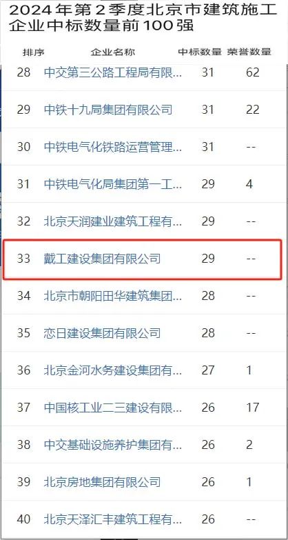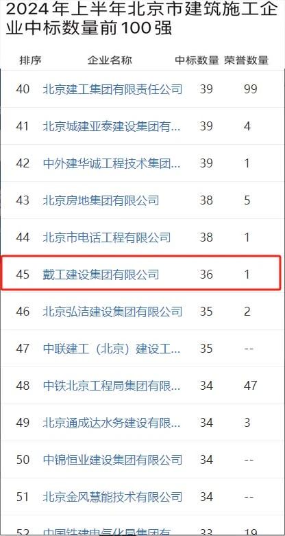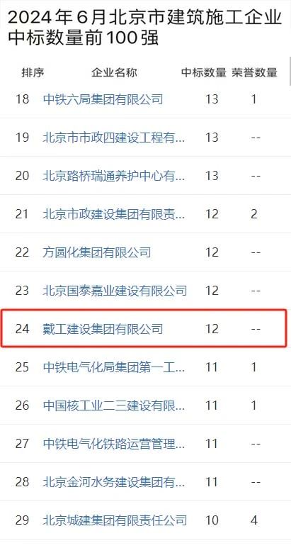 時(shí)間推進(jìn)到2024年6月,戴工集團(tuán)更是迎來了單月的高光時(shí)刻。在這個(gè)關(guān)鍵月份,戴工集團(tuán)憑借出色的項(xiàng)目策劃和執(zhí)行能力,一舉將排名提升至北京市建筑施工企業(yè)中標(biāo)數(shù)量前100強(qiáng)的第24位。這一成績的取得,充分展示了戴工集團(tuán)在短期內(nèi)的快速響應(yīng)能力和高效執(zhí)行力,也為其在市場上的進(jìn)一步拓展奠定了堅(jiān)實(shí)基礎(chǔ)。